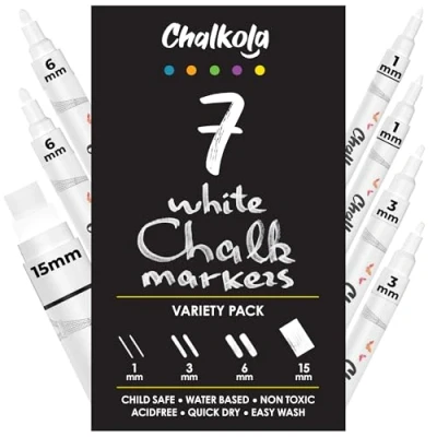 All in one Set - (2x 1mm | 3mm | 6mm) + (1x 15mm) - White chalk markers fine tip (thin), extra fine point & bold tip (thick) & jumbo 15mm - Time to replace the old dusty chalk with white chalk ink marker. Can Be Used On Many Surfaces - Use these erasable chalk paint markers to write on calendars, wedding signs, shop storefronts, milestone boards, classroom displays, LED boards, vinyl surfaces. Use as car window markers, bistro chalk markers. Perfect For Every Creator - Whether you're a teacher, artist, restaurant owner or parent, these dry erase chalk markers for blackboard create beautiful displays effortlessly in classrooms, menus, signs and home activities. Comes Off Easy - The white chalk marker will work on almost any surface! These chalk board markers are washable & will erase off on non-porous surfaces such as glass & mirrors (dry & wet erase) & permanent on porous surfaces (like wood). Long-Lasting Performance - While other markers crack and lose color under heavy use, our richly pigmented liquid chalk markers deliver smooth, consistent ink flow without skipping or fading. Tips resist fraying with continued use. Mess-Free Performance - Unlike regular chalk that creates dust and stains, these non-toxic dry erase markers for kids are washable, dustless and completely safe. No more dirty hands or chalk residue - simply wipe clean with a damp cloth. Vibrant White Color - Set includes highly opaque, bold white colors that show up bright and clear on dark surfaces. Quick-drying, smudge-resistant formula provides consistent coverage. Complete Art & Craft Solution: Perfect kids art supplies, craft supplies & creative projects. These chalk markers for chalkboard provide precise control with flexible application options for all skill levels Easy to Use - First time Prep Required - Shake marker well before first use, gently press tip to and fro to prime ink flow (10 to 30 sec), then write smoothly