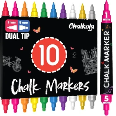 Erasable Chalkboard Paint Markers - These liquid chalk pens flow smoothly on any non-porous surface. Use as glass markers, mirror markers & window markers (dry & wet erase), becomes permanent on porous surfaces like wood. Multi-Surface Versatility - Perfect as bistro chalk markers, LED board markers & wedding markers. Create beautiful designs on menu boards, shop windows, whiteboards & milestone boards. The erasable markers properties make updates easy. Perfect for Business & Home - Ideal chalk board markers for teachers, artists & office use. Make eye-catching signs, window displays & classroom materials. These blackboard chalk markers create professional-looking displays effortlessly. Water-Based Safe Formula - Say goodbye to dusty chalk! These washable chalk markers for kids are non-toxic and dustless. The chalk paint marker formula wipes clean easily - no residue or stains on hands or surfaces. Long-Lasting Performance - While other markers crack and lose color under heavy use, our richly pigmented liquid chalk markers deliver smooth, consistent ink flow without skipping or fading. Tips resist fraying with continued use Dual Tip Design - Featuring 5mm bullet tip + Fine tip 1mm tip for versatile writing styles. Tips stay flexible with smooth ink flow, while tight-fitting caps prevent drying when stored Vibrant Color Selection - Set includes highly opaque, bold colors that show up bright and clear on dark surfaces. Quick-drying, smudge-resistant formula provides consistent coverage Complete Art & Craft Solution: Perfect kids art supplies, craft supplies & for creative projects. These chalk markers for chalkboard provide precise control with flexible application options for all skill levels