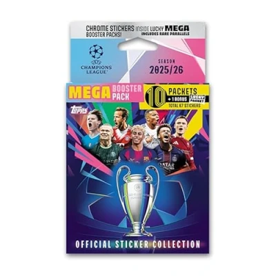 The Mega Booster Pack contains 67 stickers (10 packets plus a bonus 7 sticker packet). Look out for Chrome Stickers and rare parallels inside lucky Mega Booster Packs. The official UEFA Champions League Sticker Collection 2025/26 features all 36 teams across 574 stickers to collect and house inside an amazing 76-page album. Featuring unnumbered parallels of all squad portraits, Jersey Worn Relic sticker cards inside lucky Starter Packs, '1st' Stickers including Chrome numbered parallels plus much more! Official Licensed UEFA Product.