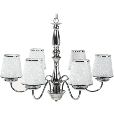 General description This elegant ambient lamp is a modern take on a classic chandelier. The design features six lights surrounded by bright shades made from high-quality acrylic, suspended on a curved frame finished in high gloss chrome. The fixture brings a glamorous touch to a hallway or entertaining area in any modern as well as traditional home. Technical specifications Product Type: Pendant Light Style: Glam General Color: Silver Main Material: Iron Additional Material: Acrylic Shade Material: Metal Wattage: Max. 40 W IP Protection Code: IP 20 Light Bulbs Required: 6 Voltage rating: 230 V (50 Hz) Dimensions: Cord Length: 160 cm, Depth: 65 cm, Width: 65 cm, Height: 127 cm Weight: 3 kg Installation Requires installation and assembly (20-40 min). Any cord length adjustments should be carried out by an electrician. Usage Suitable for light bulbs of efficiency category from A to G. Compatible with LEDs, halogens, and energy-efficient bulbs. Other information Maintenance tips: Metal: