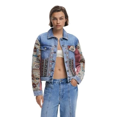Trucker denim jacket with a combination of fabrics and bohemian-inspired embroidery. Fit: Regular Sleeve: Long Front pockets Closure: Button Embroidered details When you buy cotton products from Desigual, you are supporting our investment in Better Cotton. This product is sourced through a mass balance system and may not contain Better Cotton. bettercotton.org/massbalance. Model’s measurements: Height: 178 cm; Waist: 60 cm; Hip: 89 cm Model size: M SKU: 25WWED105053 Product Sustainability Model’s measurements: Height: 178 cm; Waist: 60 cm; Hip: 89 cm Model size: M SKU: 25WWED105053 Product Sustainability Better Cotton 84% COTTON, 13% POLYESTER, 1% ACRYLIC, 1% POLYAMIDE, 1% VISCOSE