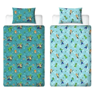 OFFICIAL PRODUCT: Officially licensed Minecraft duvet cover set with a single size reversible duvet cover and a matching pillowcase Reversible: the front of the bedding features a repeating pattern of Alex, Steve and Creepers on a blue background. The reverse features a repeating pattern of Alex, Steve, Creepers and Zombies on a light blue background. Easy care: the duvet cover is closed with press studs and can therefore be easily opened and removed for washing. The bed linen is machine washable and tumble dry at a low temperature. RESPONSIBLY MANUFACTURED: This bedding set is made from recycled materials and is made from brushed microfiber. MEASUREMENTS: Standard UK Single Bed Sizes The Minecraft Duvet Cover measures 135cm x 200cm and Pillowcase measures 74cm x 48cm