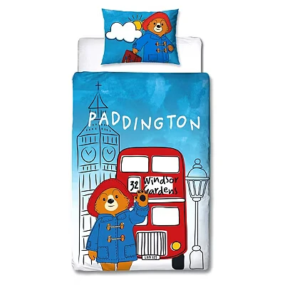 OFFICIAL PRODUCT: Officially licensed Paddington Bear bedding set includes a single bed duvet cover and pillowcase, and features Paddington travelling around London REVERSIBLE: Freshen up the look of your child’s bedroom with 2 designs in one. On the front side there’s a large print of Paddington in his blue raincoat, in front of a red London bus with Big Ben and a blue sky in the background. The reverse side features a repeating pattern of Paddington eating a marmalade sandwich, a red phone box, London bus, and Big Ben on a white background. EASY CARE: The duvet cover is closed with poppers, so it’s easy to open and remove ready for the wash! The bedding is washing machine and tumble dryer safe at a low temperature RESPONSIBLY MADE: Made from recycled materials with a 52% cotton and polyester blend, this bedding set is kind to the environment MEASUREMENTS: Standard UK single bedding size, the duvet cover measures 135 x 200cm, and the pillowcase measures 74 x 48cm