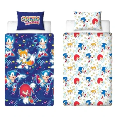 OFFICIAL PRODUCT: Officially licensed Sonic the Hedgehog bedding set, includes a single duvet cover and matching pillowcase, and features Sonic, Knuckles and Tails REVERSIBLE: Featuring a separate design on the front and back, on the front side there’s a retro design Sonic, Tails and Knuckles, with pixels and the Chaos Emeralds on a dark blue background. The reverse side features a repeating pattern of Sonic, Tails, Knuckles, and gold rings on a white background EASY CARE: The duvet cover is closed with poppers, so it’s easy to open and remove ready for the wash! The bedding is washing machine and tumble dryer safe at a low temperature RESPONSIBLY MADE: Made using recycled materials, this bedding set is made from soft brushed microfibre MEASUREMENTS: Standard UK single bedding size, the duvet cover measures 135 x 200cm, and the pillowcase measures 74 x 48cm
