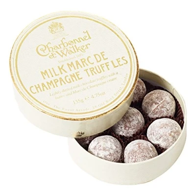 Celebrate with Charbonnel's finest milk chocolate marc de champagne truffles Unique English recipe An intense sensation of marc de champagne and creamy milk chocolate Dusted with a sprinkle of powdered sugar Presented in a beautiful keepsake box