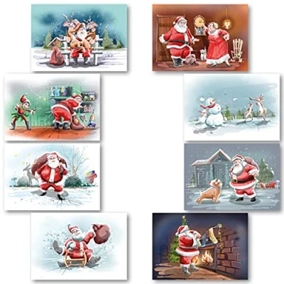 Charity Christmas Cards Pack of 24. Each card multipack has 8 different Fun Santa designs. Ecofriendly and UK made. Verse Inside. Large 172 x 122mm size.