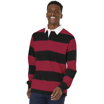 Cotton jersey with a classic 4 inch rugby stripe White twill collar stitched with reinforcing tape for added strength Heavy-duty white twill placket conceals rubber buttons Rib knit cuffs Reinforced stitching throughout for added durability