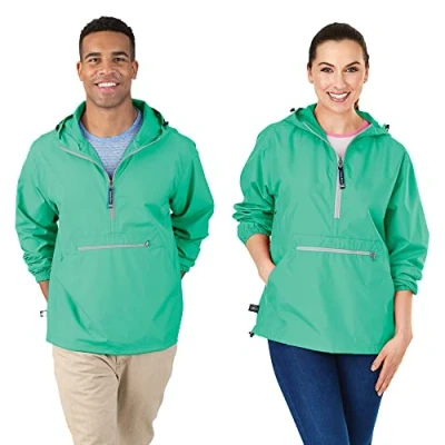 RUNS BIG. Style runs big and is oversized for women. We recommend sizing down one size for an oversized women’s fit and sizing down 2 times for a more “true to size” fit. SO CONVENIENT. This rain jacket pullover effortlessly packs away into its own front pouch pocket, for fast, easy, and compact storage. A perfect piece of outerwear that you can always keep on hand. Great for traveling. MULTIPLE OPTIONS. Available in a wide array of appealing colors. A portion of the sales from the jacket in pink are donated to Charles River Apparel's charitable "Be Pink Proud" program, supporting cancer-related initiatives. It is also perfect for monogramming by an online or your local monogramming service. School groups, sororities, sports teams, spirit wear...the possibilities are endless. COMFORTABLE QUALITY. A blend of many fine details has made this rain jacket such a big seller. Features include underarm grommets, to provide proper ventilation, elasticized cuffs, and an open bottom hem with a shockcord drawstring, for a flexible and customizable fit. The hood also has adjustable drawstings, to effectively seal out wind and rain. The jacket zips halfway down, and features a front zippered pocket, and a front pouch with open sides. EXTENSIVE SIZE RANGE. The pullover does run large therefore you may want to order a smaller size.