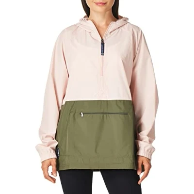 100% Softex polyester (2.06 oz/yd2), wind & water-resistant, lightweight Packs into its own Front pouch pocket with zipper closure for easy packing on the go Half-zip anorak styling Color block styling for updated look and feel Features a 3-piece hood with adjustable shockcord drawstring and elastic cuffs