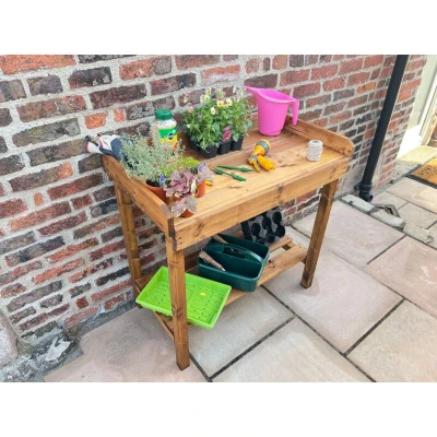 General description This Davenport Utility Garden Potting Table is an ideal addition to any garden, perfect for potting and seeding. It features a useful storage shelf and comes with a 10-year rot-free guarantee, ensuring durability and longevity. The table is treated with a water-repellent preservative to protect it from the elements. Technical specifications Dimensions: L48 x W92 x H90 cm Weight: 15 kg Installation Assembly required. Usage Ideal for potting and seeding. To maintain freshness, it is best practice to store cushions indoors when not in use. To protect and extend the life of the furniture, it is recommended to apply another coat of preservative every 6-12 months. Other information Wood is a natural product and may expand and retract depending on weather conditions, which can lead to cracking, splitting, warping, and shrinkage. Regularly check the tightness of bolts and screws. Your furniture is supplied with one coat of 'Taylor Brown' oil-based preservative.