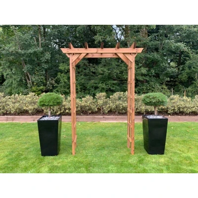 General description Grand Devonshire Wooden Arch is a beautifully crafted garden feature that adds elegance to any outdoor space. Made from high-quality Scandinavian Redwood, this arch is fully assembled and hand-finished, ensuring a premium look and feel. Technical specifications Dimensions (WxDxH): 152 x 64 x 220 cm Weight: 35 kg Material: Timber (Scandinavian Redwood) Finish: Preservative/Stain Applied Bolting: Rustproof Galvanised Zinc