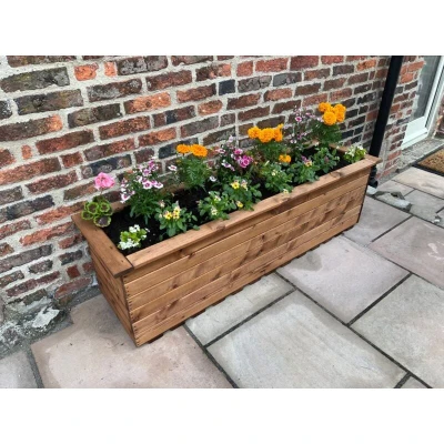 General description An effective way to effortlessly transform your patio or garden space, the Willoughby Extra Large Sleeper Trough is designed to brighten up areas of your garden. With a traditional design featuring drainage slats, this planter is perfect for growing various plants, vegetables, herbs, or fruits, creating a wonderful focal feature in your outdoor area. Technical specifications Dimensions: L48 x W161 x H45.5 cm Weight: 20.5 kg Approximate planter volume: 250 litres Other information Treated with a water repellent preservative 10 year rot free guarantee All materials are FSC-Sourced To maintain freshness, it is best practice to store cushions indoors when not in use Wood is a natural product and may expand and retract depending on weather conditions, which can lead to cracking, splitting, warping, and shrinkage It is recommended to apply another coat of preservative every 6-12 months to protect and extend the life of the furniture