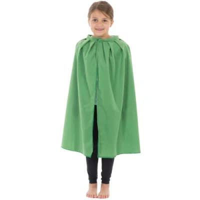 Green cape or cloak costume for children. One size 3-8 Years. The cloak is approximately 70 cm in length. The costume is designed to fit children upto 128cm tall. 100% Polyester. Machine washable. Made in England. As a precaution keep away from fire. For more information view the product details below., Manufacturer: Charlie Crow