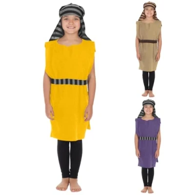 Charlie Crow Jacob Shepherd or Innkeeper costume for children. Yellow Outfit includes tunic and multi-coloured headdress. Fits kids aged 3-8 years. 100% polyester. Machine washable. Made in England. Conforms to UK, European and USA safety regulations. As a precaution keep away from fire. For more information view the product details below., Manufacturer: Charlie Crow