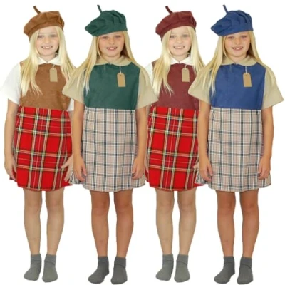 Charlie Crow WW2 Second World War Evacuee School Girl Costume for kids 5 11 Years Red, Green, Blue and Brown.