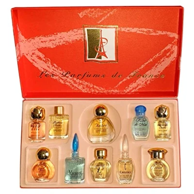 ScentsationalLuxurious Red Cartoon Box containing 10 miniature bottles of Eau de Parfum, A wide choice of different fine perfumes, moderns and classics. Contains: Magie Rose, Reine de Mai, Ambre, Ponant, Croyance, Mademoiselle Charrier, Douce Faute, Versant, Lonia, Madame Charrier.