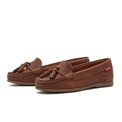 A feminine take on the summer deck shoe Low fronted and lightweight Crafted from premium nubuck leather with a jaunty tassel, contrast stitching, a Chatham label and a non-slip white rubber sole They also feature our Sole Spring Poron performance cushioning, which is anti-bacterial and offers maximum comfort and shock absorption.