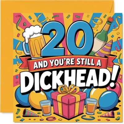 Hits just the right cheeky note for a milestone birthday, featuring the bold message '20 AND YOU'RE STILL A DICKHEAD!' in lively party colours Standout design with a playful celebration vibe-vibrant hues, confetti, and fun accents make it truly pop on the mantelpiece. Recyclable and printed in UK for a considerate choice Printed on quality gloss single sided board with an uncoated inside-no smudging when writing inside your own message. Printed on 360 micron stock for a confident, premium feel Blank inside, so there's loads of space for your own witty words or heartfelt wishes. Supplied with a matching envelope for easy gifting. The 145mm Square format is convenient to display or post Designed and printed in the UK using recyclable FSC -crafted to raise a proper smile and make their big day memorable. Ideal for a mum or dad celebrating a milestone birthday