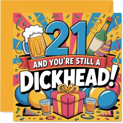 Turns 21 with a bang thanks to its cheeky '21 AND YOU'RE STILL A DICKHEAD!' slogan-ideal for anyone who can take a joke on their big day. Birthday card with a light-hearted design style Vibrant yellow, blue, pink and red graphics bring a lively party vibe, complete with drinks and confetti for true celebration energy. Recyclable and printed in UK for a considerate choice Printed on gloss single sided board with an uncoated inside-no smudging when writing inside. Made using responsibly sourced FSC board. Printed on 360 micron stock for a confident, premium feel Blank inside for your own banter or heartfelt wishes. Comes with its own envelope so it's easy to send or hand-deliver. The 145mm Square format is convenient to display or post Created in the UK and fully recyclable, this card delivers quality feel and a good laugh-perfect for those who appreciate bold humour. Ideal for a mum or dad celebrating a milestone birthday