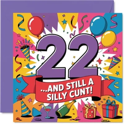 Delivers a cheeky laugh for their 22nd with its bold '..AND STILL A SILLY CUNT!' message front and centre, perfect for a mate who loves a bit of banter Features vibrant, multicolour celebration graphics that stand out on any mantelpiece and make the milestone age feel extra memorable. Recyclable and printed in UK for a considerate choice Printed on quality gloss single sided board with an uncoated inside for easy writing. No smudging when writing inside. Printed on 360 micron stock for a confident, premium feel Blank inside so you can pen your own personal message, plus a matching envelope is included for a smart finish. The 145mm Square format is convenient to display or post Printed in the UK on FSC-certified and fully recyclable, it's a feelgood choice for laughs and the planet. Ideal for a mum or dad celebrating a milestone birthday