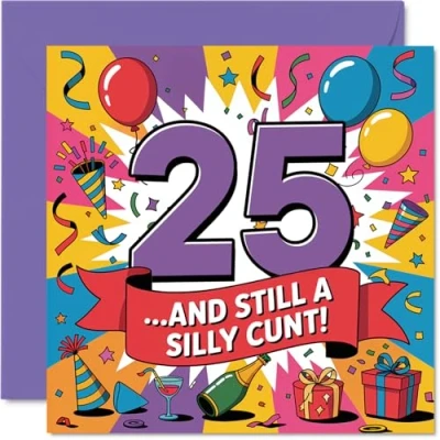 Brings a big laugh with its vibrant colours and hilarious '25..and still a silly c***!' front, poking fun at the birthday star's eternal silliness Features a bright, multicoloured motif and playful font that stands out on the mantelpiece and promises instant smiles. Recyclable and printed in UK for a considerate choice Printed on gloss single sided board with an uncoated inside for easy writing. No smudging when writing inside, so your message stays sharp. Printed on 360 micron stock for a confident, premium feel Blank inside - plenty of space for your own outrageous message or heartfelt wishes. Includes a matching envelope for easy gifting. The 145mm Square format is convenient to display or post Proudly made in the UK using FSC and fully recyclable materials, so you can celebrate with a clear conscience. Ideal for a mum or dad celebrating a milestone birthday