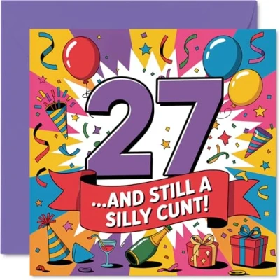 Delivers a cheeky birthday laugh with its bold '27..AND STILL A SILLY CUNT!' message set against a burst of colourful confetti and balloons Eye-catching design pops with bright. multicoloured party motifs. making it stand out on the mantelpiece and perfect for anyone who loves a bit of banter Printed on quality gloss board with an uncoated inside - No smudging when writing inside - plus made using FSC-certified materials. Printed on 360 micron stock for a confident, premium feel Blank inside for your own message and supplied with a matching envelope, so it's ready to hand over or pop in the post. The 145mm Square format is convenient to display or post Designed and printed in the UK with recyclable materials - crafted for those who appreciate a well-timed joke and a quality finish. Ideal for a mum or dad celebrating a milestone birthday