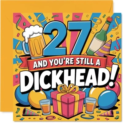 Delivers a cheeky birthday message with bold '27 AND YOU'RE STILL A DICKHEAD!' text and playful party icons for instant laughs. Birthday card with a light-hearted design style Features a lively, multicoloured motif with beers and festive decorations-perfect for anyone who likes their humour with a side of celebration Gloss-finish single sided board and uncoated inside keeps it looking sharp. No smudging when writing inside. Made in the UK with recyclable materials Blank inside, so you can pen your own hilarious or heartfelt message. Envelope included for easy gifting. The 145mm Square format is convenient to display or post Designed to stand out and get remembered-crafted with care using FSC-certified card for that feelgood quality. Ideal for a mum or dad celebrating a milestone birthday
