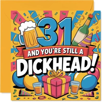 Delivers a cheeky laugh with its bold '31 AND YOU'RE STILL A DICKHEAD!' slogan and colourful party motifs - perfect for anyone who's never too old for a bit of banter Features vibrant multi-colour artwork with playful elements like drinks. confetti, and party hats to set a fun. celebratory mood on their 31st birthday Printed in the UK on quality gloss single sided board with an uncoated inside for easy writing - no smudging when writing inside your own message Blank inside, so you can add your very own witty or heartfelt note. Includes a matching envelope for easy gifting. The 145mm Square format is convenient to display or post Designed to raise a grin and crafted to last, making it an unforgettable card for the big day - ideal for a mate, sibling, or colleague. Ideal for a mum or dad celebrating a milestone birthday