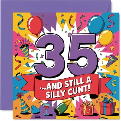Pokes fun at turning 35 with a punchy sense of humour-features a big, bold '35' and a cheeky message that's sure to make them grin. Birthday card with a light-hearted design style Vibrant, multicoloured graphics and playful fonts create a lively birthday vibe that suits anyone who enjoys a laugh. Recyclable and printed in UK for a considerate choice Printed on quality gloss single sided board with an uncoated inside-No smudging when writing inside-eco-friendly and recyclable. Printed on 360 micron stock for a confident, premium feel Blank inside for your own message and comes with a matching envelope, making it effortless to send your own cheeky wishes. The 145mm Square format is convenient to display or post Designed and printed in the UK using FSC-certified materials-share a smile knowing you're choosing a card that's both fun and responsible. Ideal for a mum or dad celebrating a milestone birthday