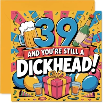 A hilariously cheeky way to mark turning 39 - the bold text and playful insult will have everyone grinning. especially with its bright, eye-catching colours Features a vibrant and modern design, making this card stand out on any mantelpiece and perfect for anyone who loves a bit of banter on their birthday Gloss single sided board with an uncoated inside for a premium feel. No smudging when writing inside, so your message stays crisp and clear. Printed on 360 micron stock for a confident, premium feel Blank inside for your own message, paired with a quality envelope - ready for you to personalise and pop straight in the post. The 145mm Square format is convenient to display or post Designed and printed in the UK on FSC-certified, recyclable - bringing you a card you can feel good about sending. Ideal for a mum or dad celebrating a milestone birthday