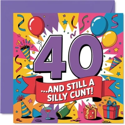 Celebrates that milestone 40th with a cheeky twist-vivid '40' text and playful confetti make it a real attention-grabber. Birthday card with a light-hearted design style Features a vibrant party scene bursting with colourful balloons and energetic confetti, guaranteed to liven up the big day. Recyclable and printed in UK for a considerate choice Printed on quality gloss board with an uncoated inside for easy writing. No smudging when writing inside. Printed on 360 micron stock for a confident, premium feel Blank inside, so you can pen your own outrageous message. Comes with an envelope for easy gifting. The 145mm Square format is convenient to display or post Designed and printed in the UK using FSC-certified, recyclable -because big laughs shouldn't cost the earth. Ideal for a mum or dad celebrating a milestone birthday