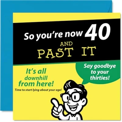 A brilliantly cheeky way to mark the big 4-0, this card features a cartoon character and tongue-in-cheek jokes about waving goodbye to your thirties Standout design boasts bold yellow. black, and green colours with playful humour. guaranteed to get a grin from anyone taking their first steps into their forties Printed in the UK on glossy, FSC-certified board with a matte, uncoated inside-no smudging when writing inside. Eco-friendly and fully recyclable too Inside message: Enjoy the time you still have left! White envelope included for easy gifting. The 145mm Square format is convenient to display or post Ideal for anyone with a wicked sense of humour-suits friends, colleagues or family. Crafted to make their milestone birthday a proper laugh. Ideal for a mum or dad celebrating a milestone birthday
