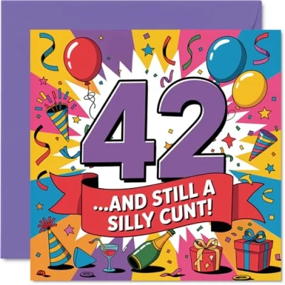 Delivers a hilarious punch with its cheeky message and vibrant '42' front, guaranteed to get a laugh from anyone who doesn't take ageing too seriously Features bold, multicoloured graphics and playful celebratory details that stand out from the crowd-makes any birthday extra memorable. Recyclable and printed in UK for a considerate choice Printed on glossy board with an uncoated inside for easy, no smudging when writing inside. Made using FSC-certified board for a planet-friendly touch Blank inside so you can add your own witty or heartfelt note. Comes with a matching envelope for an easy finishing touch. The 145mm Square format is convenient to display or post Designed in the UK with care and recyclable materials-ideal for those who appreciate a card that's as cheeky as it is quality. Ideal for a mum or dad celebrating a milestone birthday