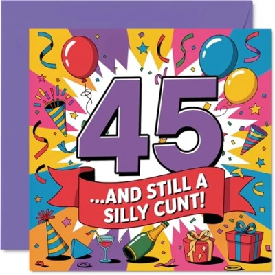 Cracks a smile with its cheeky sense of humour and eye-catching '45' front and centre - ideal for anyone who refuses to grow up. Birthday card with a light-hearted design style Features a vibrant, multi-colour celebration motif with bold numbers and playful doodles for a fun, modern look. Recyclable and printed in UK for a considerate choice Printed on quality gloss single sided board with an uncoated inside. No smudging when writing inside. Printed on 360 micron stock for a confident, premium feel Blank inside for your own message, so you can personalise your banter - includes envelope for easy gifting. The 145mm Square format is convenient to display or post Designed and printed in the UK with recyclable materials and FSC-certified - keeping things responsible as well as cheeky. Ideal for a mum or dad celebrating a milestone birthday