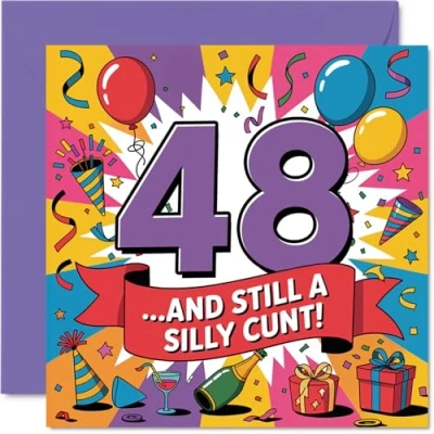 Turns an ordinary birthday into a cracking laugh - features '48' in big, bold print surrounded by colourful balloons and confetti. Birthday card with a light-hearted design style Lively party hats and a riot of multicolour details give the card a proper festive vibe, sure to stand out among the usual birthday bunch. Recyclable and printed in UK for a considerate choice Printed on gloss single sided board with an uncoated inside. No smudging when writing inside, so your message stays crisp and clear. Printed on 360 micron stock for a confident, premium feel Blank inside for your own hilarious message. Comes complete with an envelope to keep it ready for the big day. The 145mm Square format is convenient to display or post Made with FSC-certified and fully recyclable - crafted in the UK for quality you can feel good about. Ideal for a mum or dad celebrating a milestone birthday
