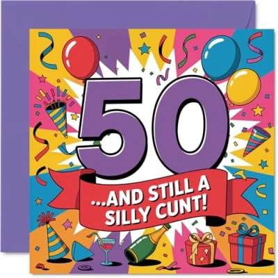 Cheeky 50th Birthday Card Bold Laughs at 50 Vibrant Multi colour Design with Playful Graphics 145mm Square, Envelope Included