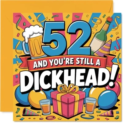 Genuinely cheeky and sure to cause a giggle, this card's '52 AND YOU'RE STILL A DICKHEAD!' slogan, complete with vibrant party décor, nails that playful birthday banter Bright yellow. blue. red and green party motifs. plus cheeky beer illustrations. make this card stand out on any mantel - perfect for anyone whose sense of humour hasn't faded Printed in the UK using recyclable materials and FSC-certified board, with a gloss finish outside and uncoated inside. No smudging when writing inside Blank inside so you can add your own personal touch. Envelope included for easy gifting. The 145mm Square format is convenient to display or post A fuss-free, top-quality card that's ideal for a mate, sibling or colleague who appreciates a good laugh on their big day. Ideal for a mum or dad celebrating a milestone birthday