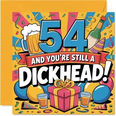 Delivers a cheeky bit of birthday banter with its bright yellow cover and the playful '54 AND YOU'RE STILL A DICKHEAD!' headline. Birthday card with a light-hearted design style Lively motif featuring colourful drinks, party hats and festive decorations, making it stand out from the usual birthday cards. Recyclable and printed in UK for a considerate choice Printed on glossy single-sided board with an uncoated inside-no smudging when writing inside. Made using FSC board for peace of mind. Printed on 360 micron stock for a confident, premium feel Blank inside so you can add your own personal message. Includes a quality envelope for easy gifting. The 145mm Square format is convenient to display or post Designed and printed in the UK, recyclable and ready to put a proper smile on anyone's face-ideal for mates, siblings or colleagues. Ideal for a mum or dad celebrating a milestone birthday