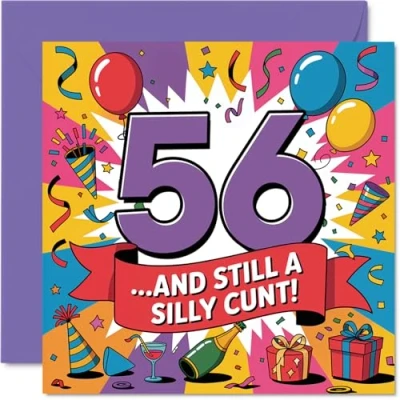 Playfully celebrates turning 56 with a bold, cheeky twist that's bound to make them laugh - those bright party balloons set the perfect fun scene Vivid multicolour artwork with confetti and party motifs creates a lively vibe, making this card stand out among the usual birthday bunch. Recyclable and printed in UK for a considerate choice Printed on quality gloss single sided board with an uncoated inside for easy writing. No smudging when writing inside - ideal for heartfelt or cheeky messages Blank inside, so you can pen your own message - comes complete with a matching envelope for easy gifting. The 145mm Square format is convenient to display or post Proudly made with FSC-certified and fully recyclable materials. Designed and printed in the UK for that extra thoughtful touch. Ideal for a mum or dad celebrating a milestone birthday