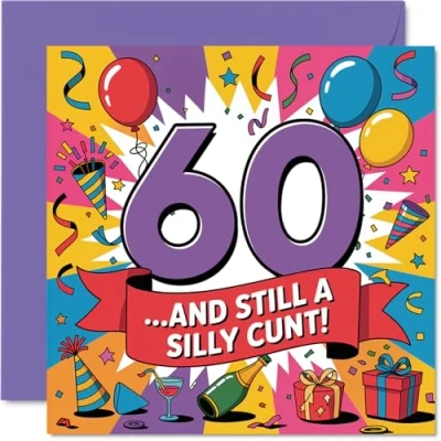 Brings a big grin with its outrageous sense of humour and vibrant '60' centrepiece surrounded by party icons. Birthday card with a light-hearted design style Standout multicolour design adds extra oomph, perfect for anyone who loves a cheeky laugh on their big day. Recyclable and printed in UK for a considerate choice Printed on glossy FSC-certified board with an uncoated inside-no smudging when writing inside and fully recyclable. Printed on 360 micron stock for a confident, premium feel Blank inside, so you can pen your own banter or heartfelt wishes; comes with a quality envelope for easy gifting. The 145mm Square format is convenient to display or post Designed and printed in the UK for those who don't take themselves too seriously-ideal for anyone who loves a good giggle. Ideal for a mum or dad celebrating a milestone birthday