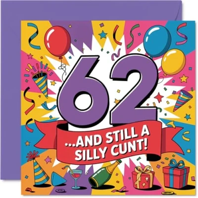 A playful way to mark their 62nd with a laugh - features large, bright numbers and a cheeky slogan that's sure to raise a grin. Birthday card with a light-hearted design style Colourful celebration design with bold multicoloured graphics makes this card impossible to miss amongst the birthday post. Recyclable and printed in UK for a considerate choice Printed on quality gloss single sided board with an uncoated inside. No smudging when writing inside, so your personal message stays neat. Printed on 360 micron stock for a confident, premium feel Blank inside for your own witty wishes. Includes an envelope, ready for gifting or popping straight in the post. The 145mm Square format is convenient to display or post Designed and printed in the UK using recyclable materials and FSC-certified - a card you can feel good about sending. Ideal for a mum or dad celebrating a milestone birthday