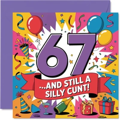 Cheeky 67th Birthday Card Bold Laughs for Turning 67 Vibrant Multicolour Design with Playful Graphics Guaranteed to Make Them Grin 145mm Square, Envelope Included