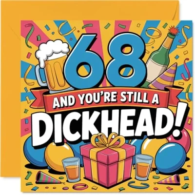 Guaranteed to spark laughter, this card features the cheeky message '68 AND YOU'RE STILL A DICKHEAD!' in bright, playful colours with party drinks and balloons Vibrant motif with bold lettering and a festive celebration scene makes it stand out on any mantelpiece or office desk. Recyclable and printed in UK for a considerate choice Printed on quality gloss single sided board with an uncoated inside, so no smudging when writing inside your own message. Printed on 360 micron stock for a confident, premium feel Blank inside for your personal touch and comes complete with an envelope for easy gifting. The 145mm Square format is convenient to display or post Designed in the UK using FSC certified and fully recyclable-so you can feel good about your choice. Ideal for a mum or dad celebrating a milestone birthday