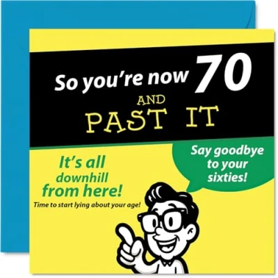 Packed with tongue-in-cheek humour, this card features lines like 'It's all downhill from here!' to poke fun at reaching the big 7-0. Birthday card with a light-hearted design style Lively yellow, black and green design stands out from the crowd, making it a cheeky centrepiece for any milestone celebration. Recyclable and printed in UK for a considerate choice Printed on gloss single sided board with an uncoated inside. No smudging when writing inside. Recyclable and made using FSC certified board. Printed on 360 micron stock for a confident, premium feel Inside message: Enjoy the time you still have left! Comes with an envelope for easy gifting. The 145mm Square format is convenient to display or post Created in the UK with attention to detail, this card is perfect to give a proper laugh and help make their 70th truly memorable. Ideal for a mum or dad celebrating a milestone birthday
