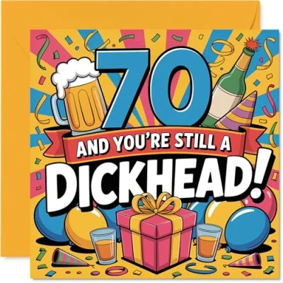 Gets everyone chuckling with its straight-talking humour and the huge '70 AND YOU'RE STILL A DICKHEAD!' splashed across the front. Birthday card with a light-hearted design style Features a bright and festive design with bold lettering in yellow, blue, pink, and red for a party-ready vibe. Recyclable and printed in UK for a considerate choice Printed on gloss single sided board with an uncoated inside-no smudging when writing inside. Made using FSC certified board for peace of mind Blank inside, so you can pen your own cheeky wishes. Comes complete with an envelope, ready to send. The 145mm Square format is convenient to display or post Made in the UK with recyclable materials-send your birthday banter with confidence, knowing it's responsibly sourced. Ideal for a mum or dad celebrating a milestone birthday