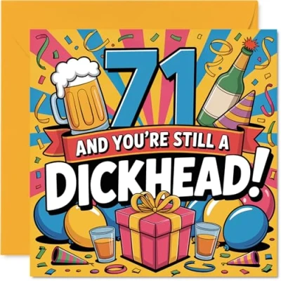Cheeky 71st Birthday Card Bold Laughs for Their Big Vibrant Design with Party Drinks and Festive Decorations 145mm Square, Envelope Included