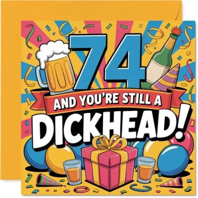 Full of cheeky humour, this card shouts out '74 AND YOU'RE STILL A DICKHEAD!' in big, playful lettering, making it a brilliant ice-breaker for the birthday bash Stand-out design with eye-catching yellow. blue, and pink colours plus lively party illustrations-perfect for anyone who enjoys a bit of banter Printed on quality gloss board with an uncoated inside, so you can scribble your own message without smudging. Eco-friendly and recyclable, too Blank inside for your personal message. Comes with an envelope, making it easy to send smiles straight away. The 145mm Square format is convenient to display or post Designed and printed in the UK using FSC-certified card. Give with confidence-this card is sure to get a grin (or even a groan). Ideal for a mum or dad celebrating a milestone birthday