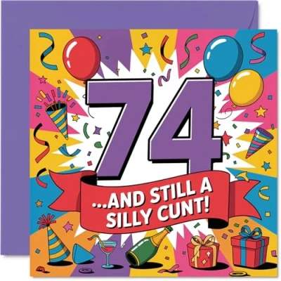 Cheeky 74th Birthday Card Vibrant Laughs at 74 Bold Multicoloured Design with Playful Bleeped out Humour Guaranteed to Get a Grin 145mm Square, Envelope Included