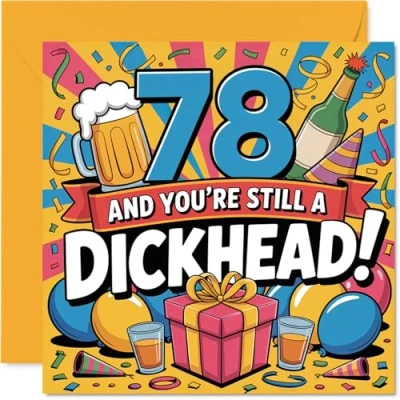 Brings a big grin with its playful '78 AND YOU'RE STILL A DICKHEAD!' slogan front and centre - the perfect cheeky surprise to mark a milestone Features bold, bright party motifs and a colourful, eye-catching layout that lights up any birthday celebration with proper banter. Recyclable and printed in UK for a considerate choice Printed on quality gloss single sided board with an uncoated inside for easy writing. No smudging when writing inside. Made with FSC board and fully recyclable Blank inside so you can pen your own cheeky or heartfelt message. Includes a matching envelope to pop straight in the post. The 145mm Square format is convenient to display or post Proudly designed and printed in the UK for top-notch quality and a good giggle - ideal for anyone who loves a bit of birthday mischief. Ideal for a mum or dad celebrating a milestone birthday