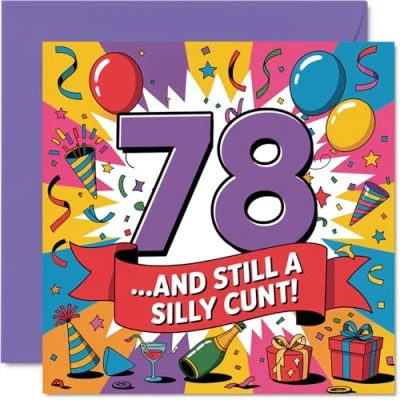 Brings a cheeky grin with its vibrant '78..AND STILL A SILLY CUNT!' message in bold, colourful style-perfect for celebrating a fun-loving character Features a lively multicoloured motif and playful typeface, making it stand out on any mantelpiece and sure to be remembered long after the party Printed on gloss single sided board with an uncoated inside, so there's no smudging when writing inside-quality you can feel. Printed on 360 micron stock for a confident, premium feel Blank inside to add your own personal touch, plus comes complete with an envelope for easy gifting. The 145mm Square format is convenient to display or post Proudly made in the UK using FSC-certified and fully recyclable materials, offering a responsible and memorable greeting. Ideal for a mum or dad celebrating a milestone birthday
